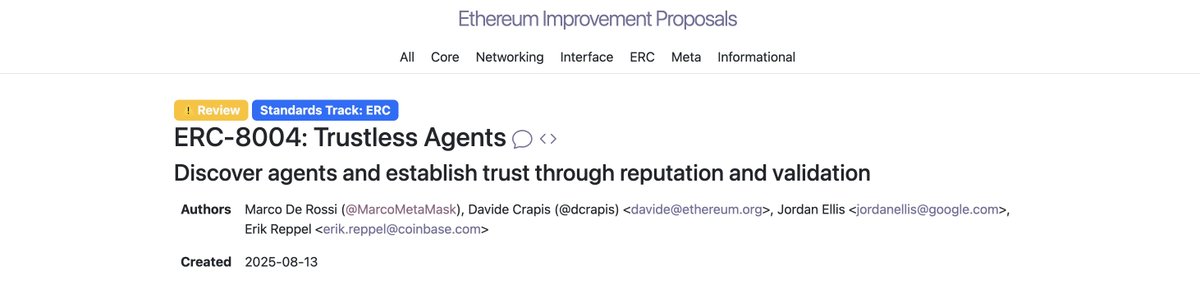 由4位作者在8月13日共同提出:MetaMask 的AI Lead @marco_derossi, 以太坊基金会EF 的AI Lead @DavideCrapis, 来自Google 的 @jordan0ellis 和Coinbase 的Head of eng @programmer.