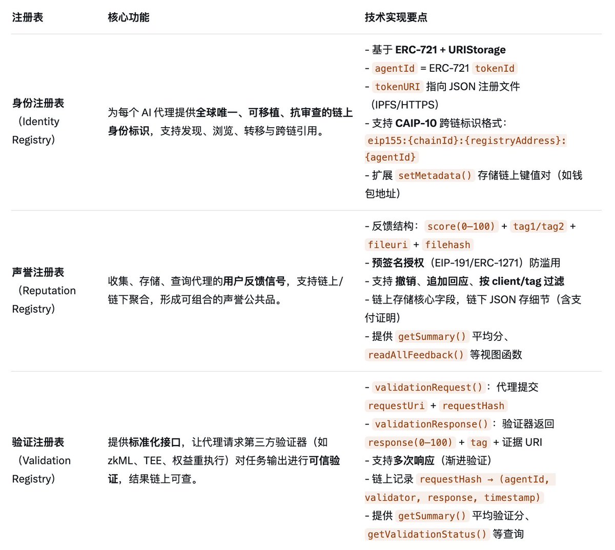 基于ERC-721 赋予每个Agent 独一无二的身份,基于存储在链上的用户反馈信号赋予Agent 声誉,基于第三方验证器(zkML、TEE、权益重执行等)对任务输出结果进行可信验证。