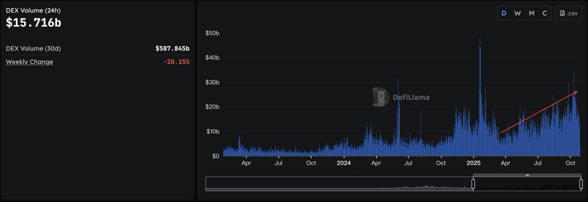 DEX 交易量是链上牛熊的晴雨表,据Defillama 数据,近30天全网累计交易量接近5900亿美元。周累计交易量虽然有一定回落,但拉长周期看链上活动仍然处于牛市活跃区间。