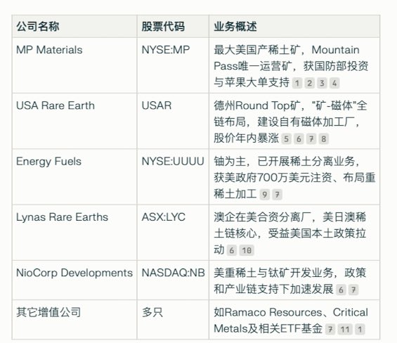 【美国禁止向中国出口芯片的法案】 【中国稀土出口管制新规】 美国防控中国芯片产业崛起,中国则利用稀土资源限制美欧高科技产业供应安全。 美国本土稀土矿山和加工厂(如MP Materials、USA Rare Earth、Energy Fuels等)业务扩张,国防部和政府已投入数十亿美元支持这些企业扩大产能,从而逐步降低对中国的依赖。
