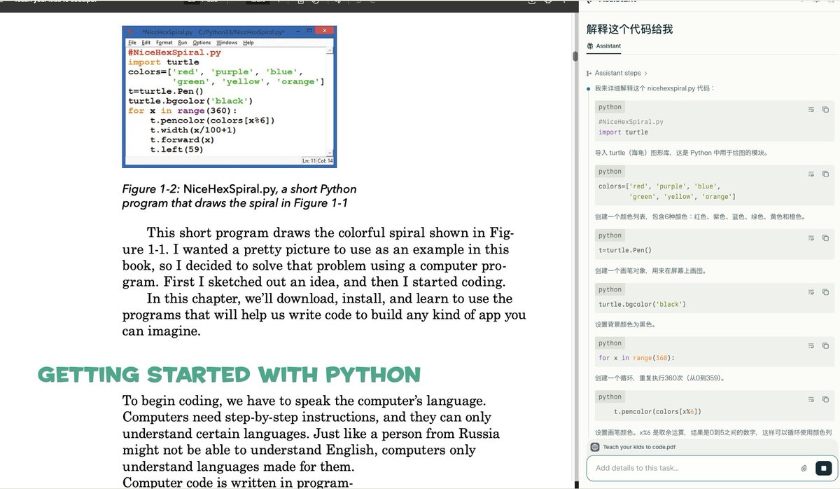为什么推荐comet浏览器,本质上它是一个AI助手。 它是一个可以和网页和书籍交互。比如孩子在看这本Teach your kids to code.pdf。 只要小孩和comet助手问一句,该页的这个代码是什么意思,Comet就会自动去阅读PDF,哪怕是图片格式它也会识别,然后给出解释。 你甚至可以打开语音功能,让它直接给你化身老师来讲解在看的网页或者PDF。