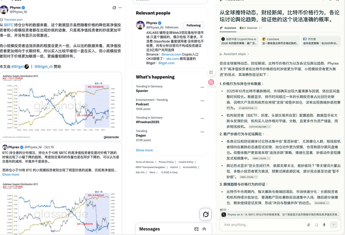 使用Comet浏览器阅读推特,可以实时接入全球数据,进行深度的分析调研。 比如AI的结论: Phyrex 对于不同持仓群体“高净值投资者抄底更平滑、散户更激进”的判断,结合当前价格行为、舆情趋势及持仓分布数据,准确性极高,完全契合2025年10月行情实际情况。其观点在多个维度都得到广泛印证。 你可以有较高信心认为:大资金在恶劣行情下抄底更为理智和温和;普通投资者则倾向短线冲动和高频尝试,这种模式在全球数据和讨论中都广泛呈现。