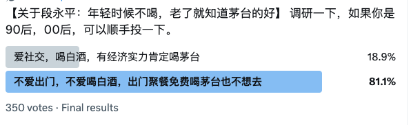 【关于段永平:年轻时候不喝,老了就知道茅台的好】 调研一下,如果你是90后,00后,可以顺手投一下。