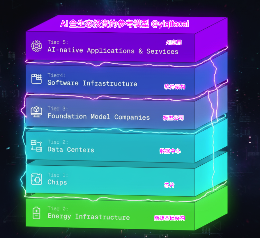 AI基础设施投资分层图,所以我相信google是一定会成为一个超越英伟达的公司。 ✅Tier 5: AI原生应用与服务 指完全基于人工智能开发的新型应用和服务,包括智能助手、内容生成、智能办公与创意工具等,面向终端用户或企业直接创造价值。 ✅Tier 4: 软件基础设施 为AI应用和大模型提供底层支撑的软件平台和工具,包括云计算服务、人工智能开发平台、分布式计算框架、API平台等,帮助开发者与企业更高效地构建和部署AI系统。 ✅Tier 3: 基础模型公司 专注于开发和训练通用性强的大型人工智能模型(如通用大语言模型、多模态模型等),这些模型可被广泛应用和二次开发,推动各种AI创新。 ✅Tier 2: 数据中心 承载大规模AI计算所需的数据存储与算力基础设施,包含云数据中心、边缘数据中心以及各类高性能GPU/AI算力服务器集群,是AI产业的“计算引擎”。 ✅Tier 1: 芯片(半导体/AI芯片) 为AI运算提供底层硬件支持的各类高性能处理器,包括GPU、AI专用芯片、CPU、FPGA等,是实现高效人工智能计算的核心硬件基础。 ✅Tier 0: 能源基础设施 为AI数据中心和算力集群提供稳定、大规模的电力、储能及可再生能源等保障,是AI时代整个生态持续运行的“能量底座”